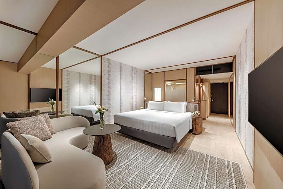Consisting of two interconnecting rooms fitted with floor-to-ceiling windows that open up to views of the city skyline, each air-conditioned room features a 40-inch LCD smart TV, a desk with an ergonomic Herman Miller chair, mini-bar and a Nespresso machine. The private bathroom includes speakers, a rain shower and a Kaldewei.